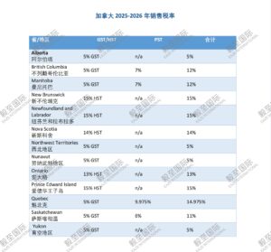 - 销售税(GST/HST): 与所得税一样,销售税也分为联邦及省两部分,但有的省如安省会合并在一起称为Harmonized Sales Tax (HST),有的省如BC省则分为联邦税GST和省税Provincial Sales Tax (PST),详细的销售税率可以参见下图。