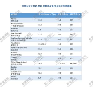 加拿大公司所得税包含联邦及省两部分,税率根据公司注册地所在省份而定。因此在这一点上,联邦公司与省公司没有区别。比如一家注册地在安省的联邦公司与安省公司的所得税率相同,具体税率可以参考左图。